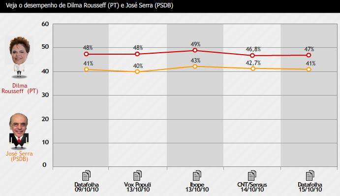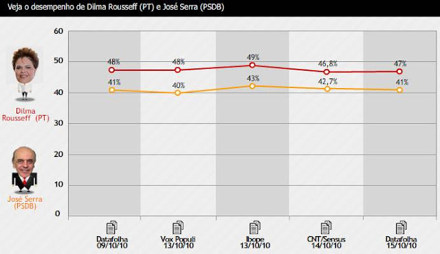 A mais recente pesquisa para a disputa pela Presidência, divulgada na quinta-feira (14) pela CNT/Sensus, também mostrou Dilma à frente do tucano. Na Sensus, Dilma tinha 52,3% dos votos válidos, contra 47,7% do adversário do PSDB.