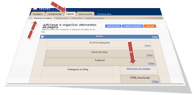 Entre no Layout, seta 1 Elemento de pagina, seta 2, em seguida clique em “Adicionar um Gadget” seta 3.